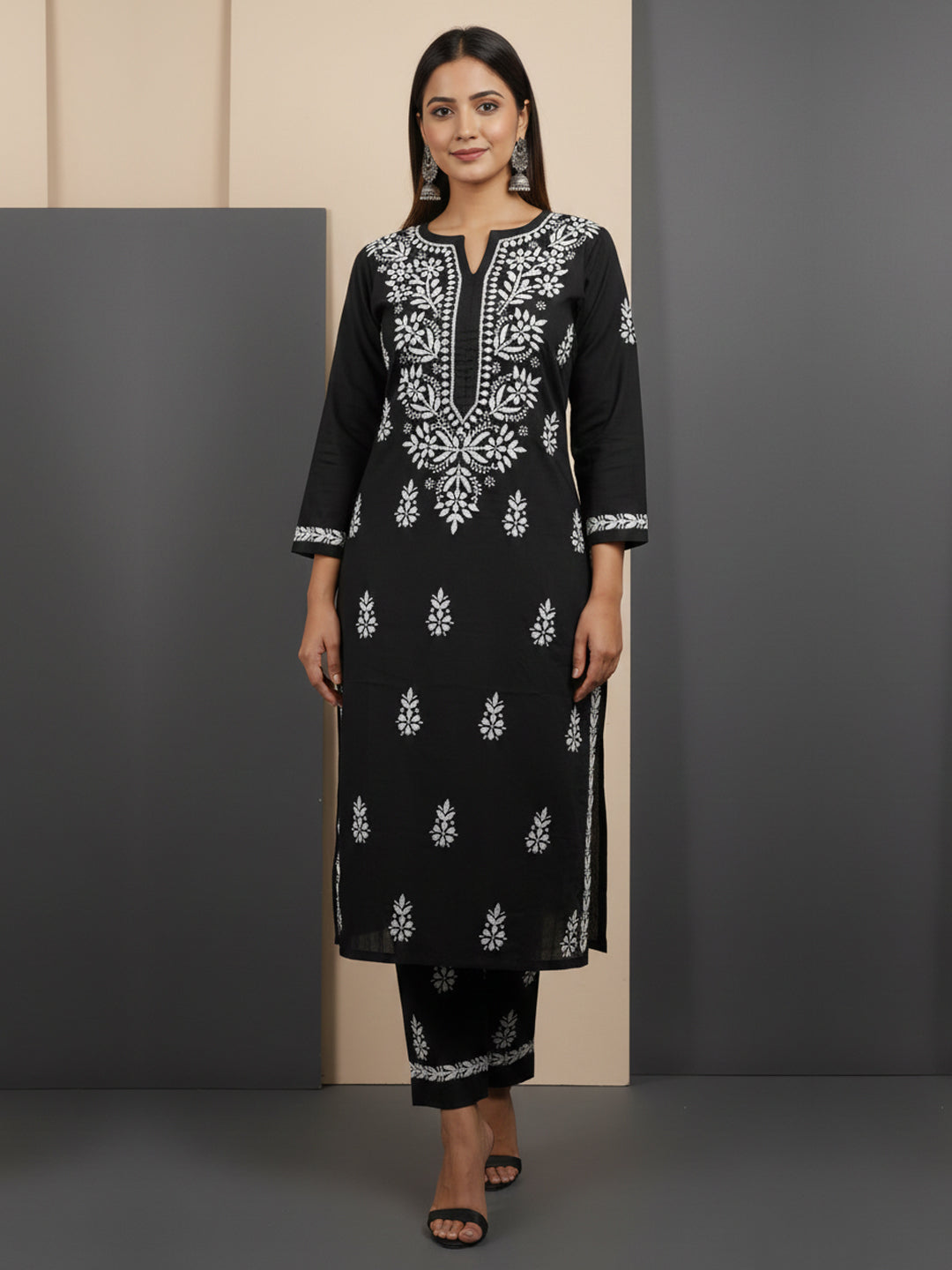 Women Hand Embroidered Chikankari Cotton kurta set PC4107KS Black