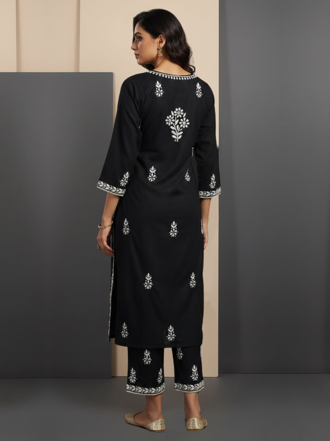 Hand Embroidered Cotton Chikankari kurtaset ,has a round neck,three-quarter Sleeves, embroidered detail,Chikankari cotton