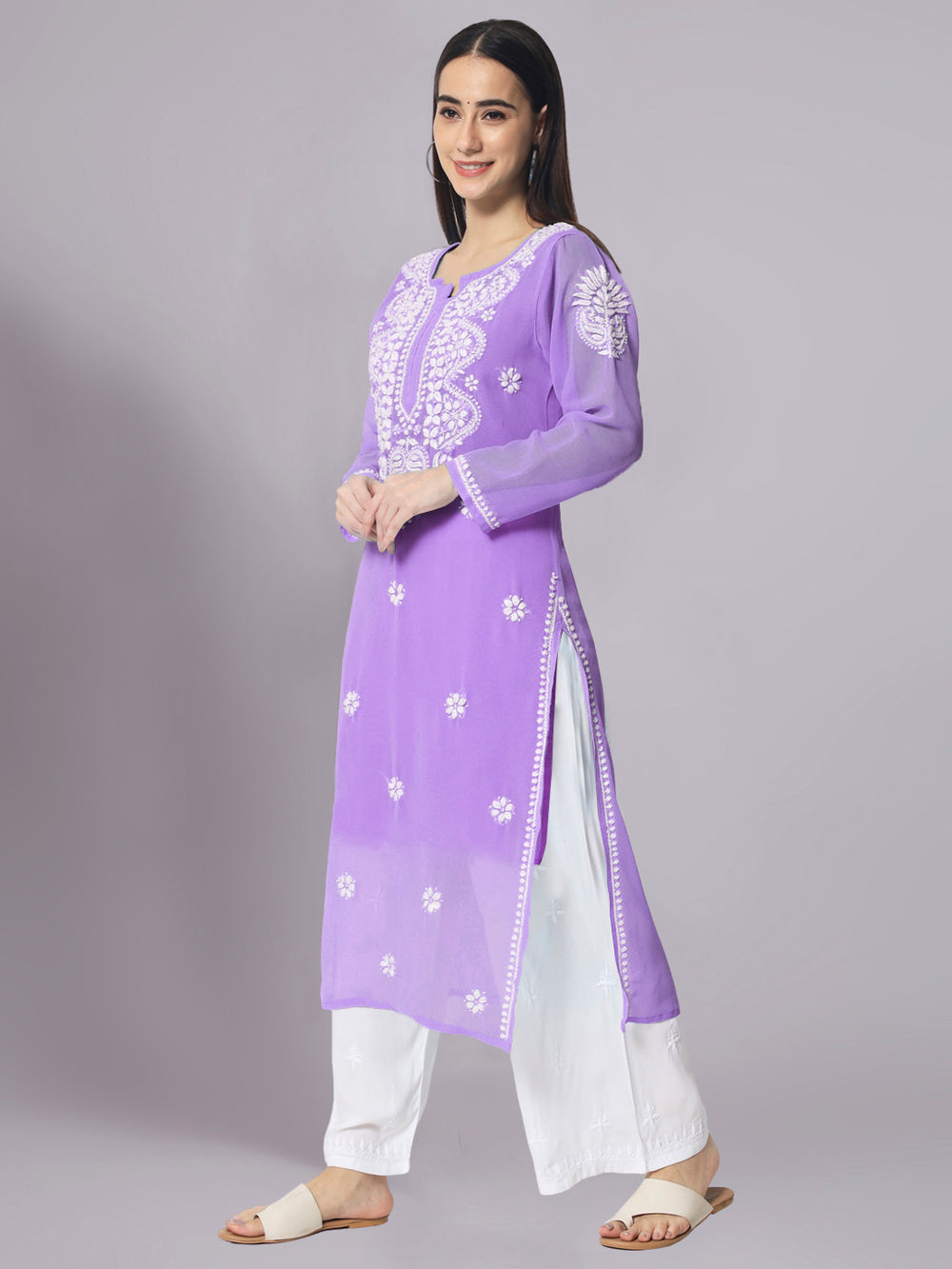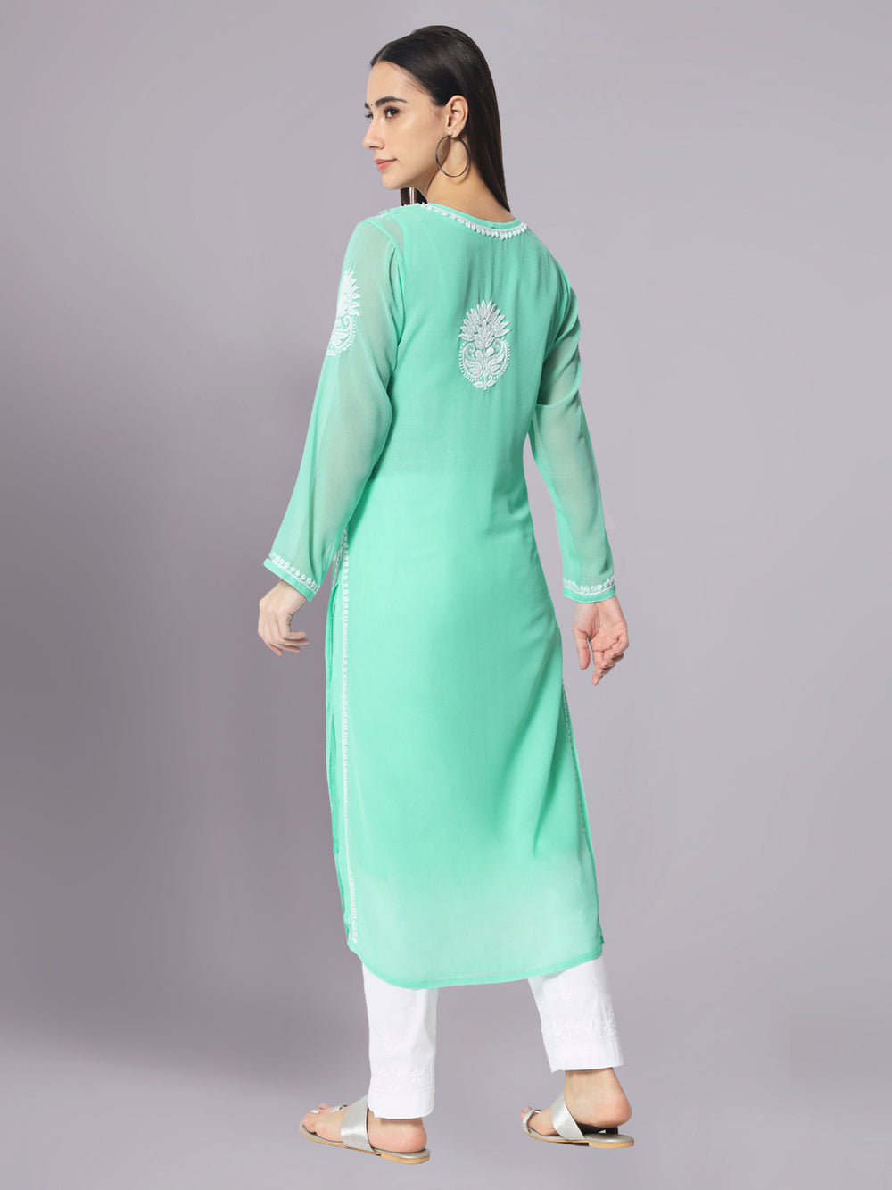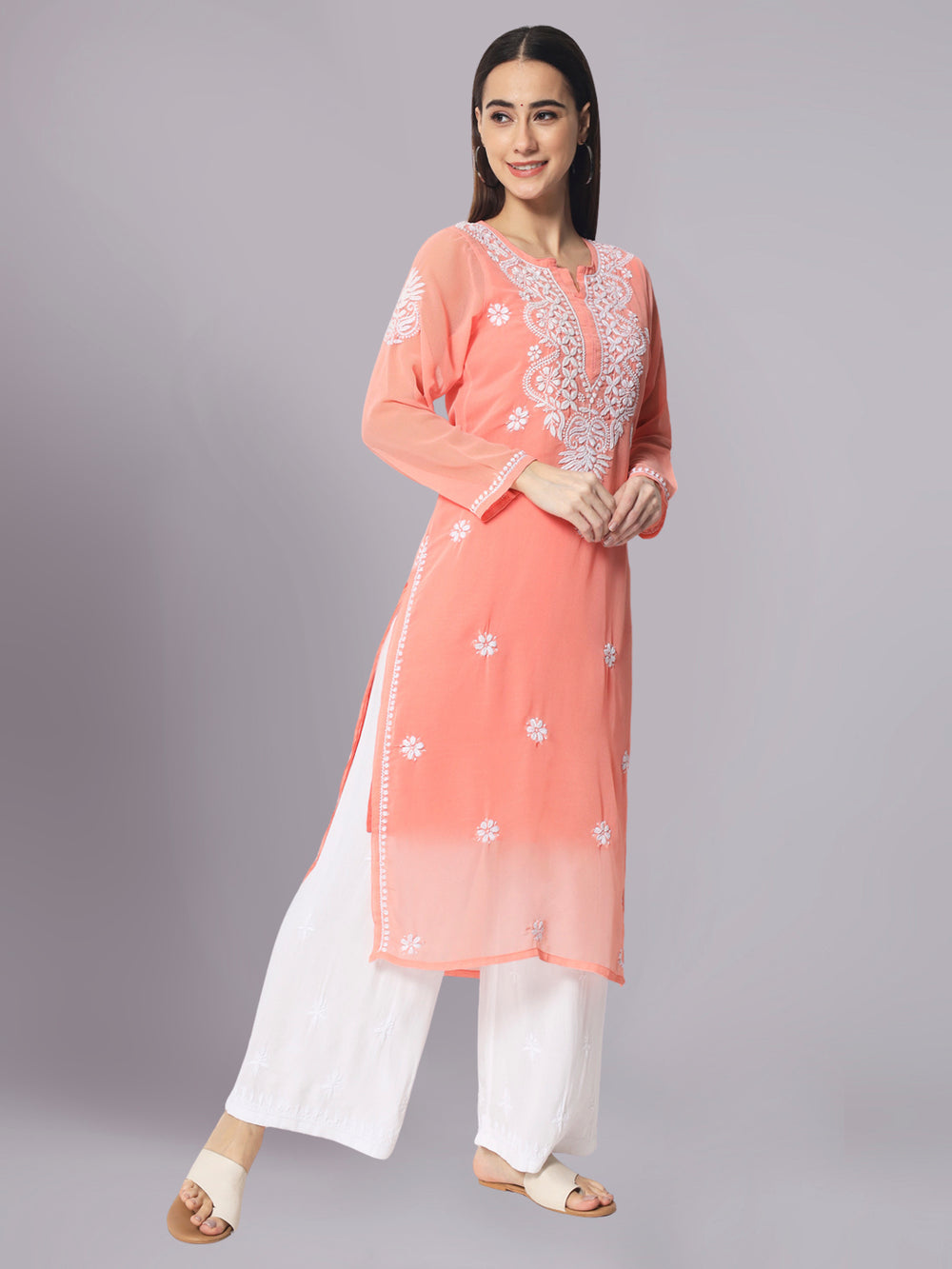 Our Georgette Chikankari Kurtis come in a variety of hues and designs, offering endless styling possibilities. Whether you pair them with trousers, palazzos, or a skirt, these Kurtis effortlessly enhance your ensemble. Adapt your look to any occasion and radiate confidence and poise.