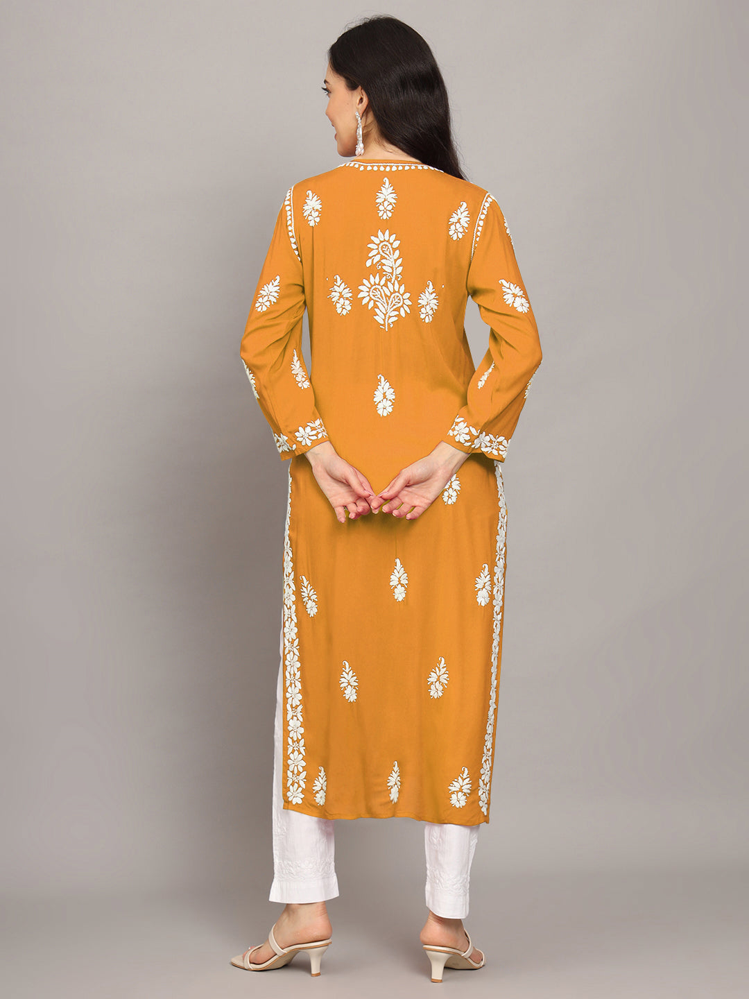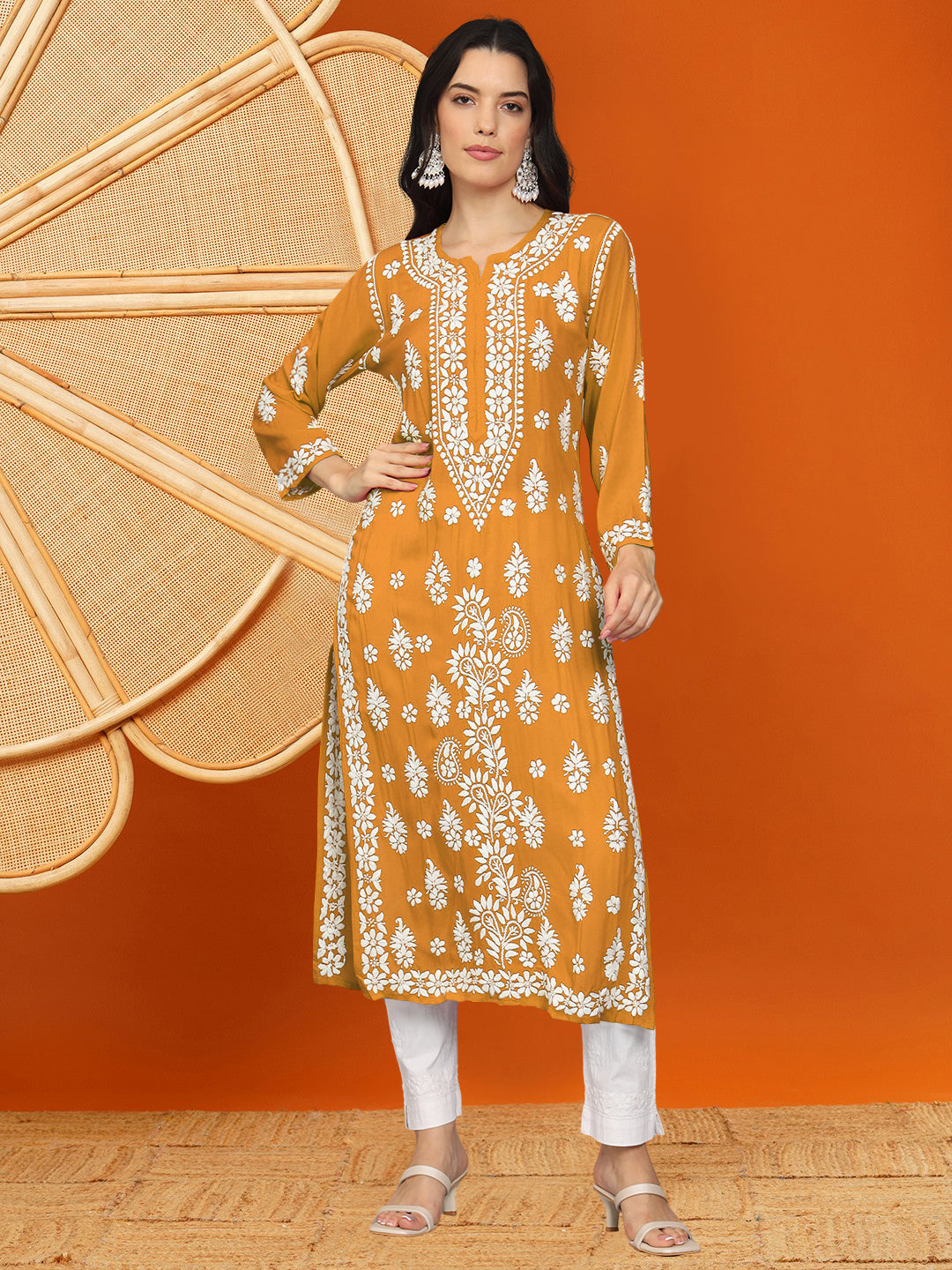 Hand Embroidered Modal Chikankari kurta ,has a round neck,three-quarter Sleeves, embroidered detail,Chikankari Modal