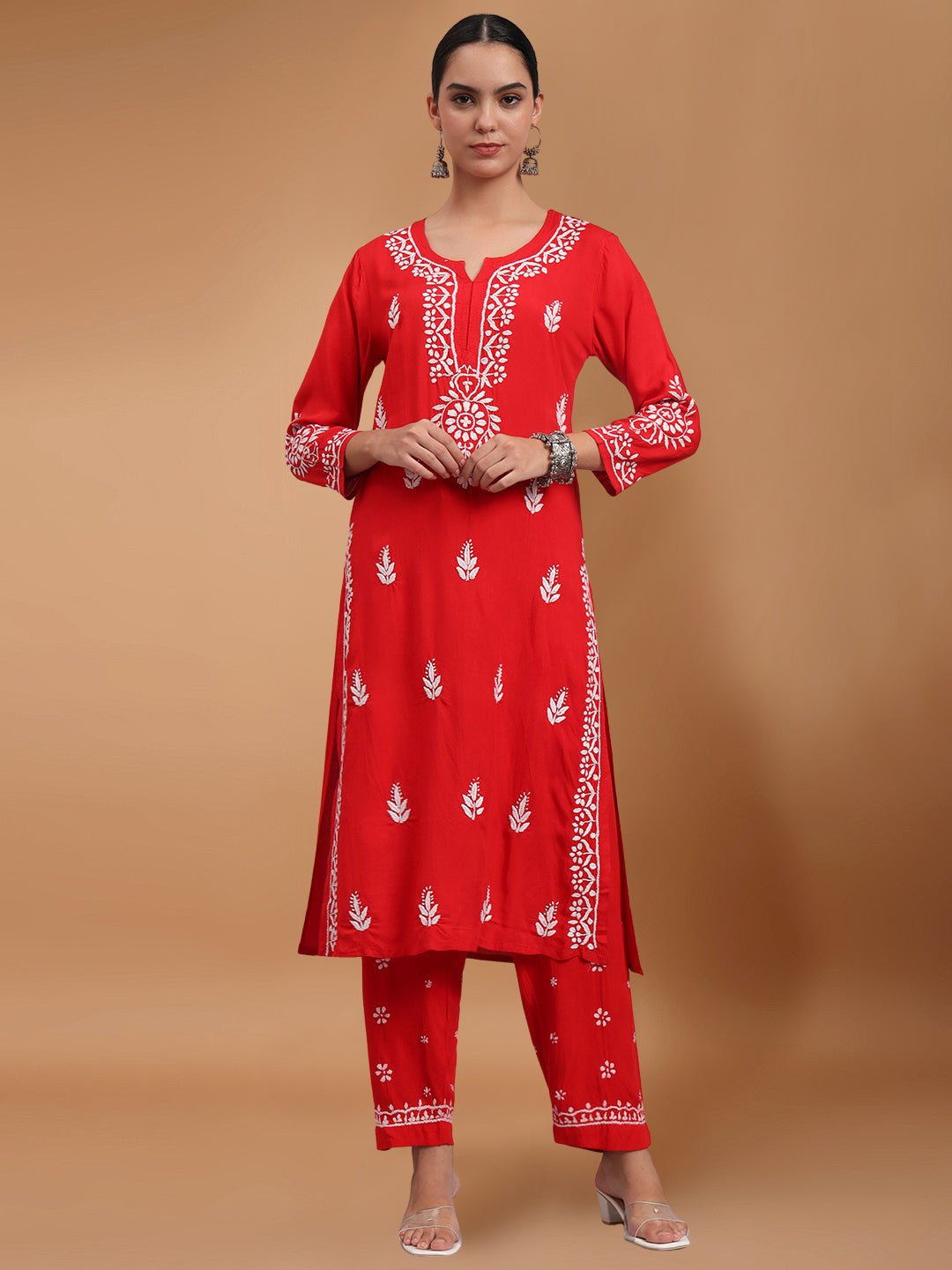 Hand Embroidered Rayon Chikankari kurtaset ,has a round neck,three-quarter Sleeves, embroidered detail,Chikankari Rayon
